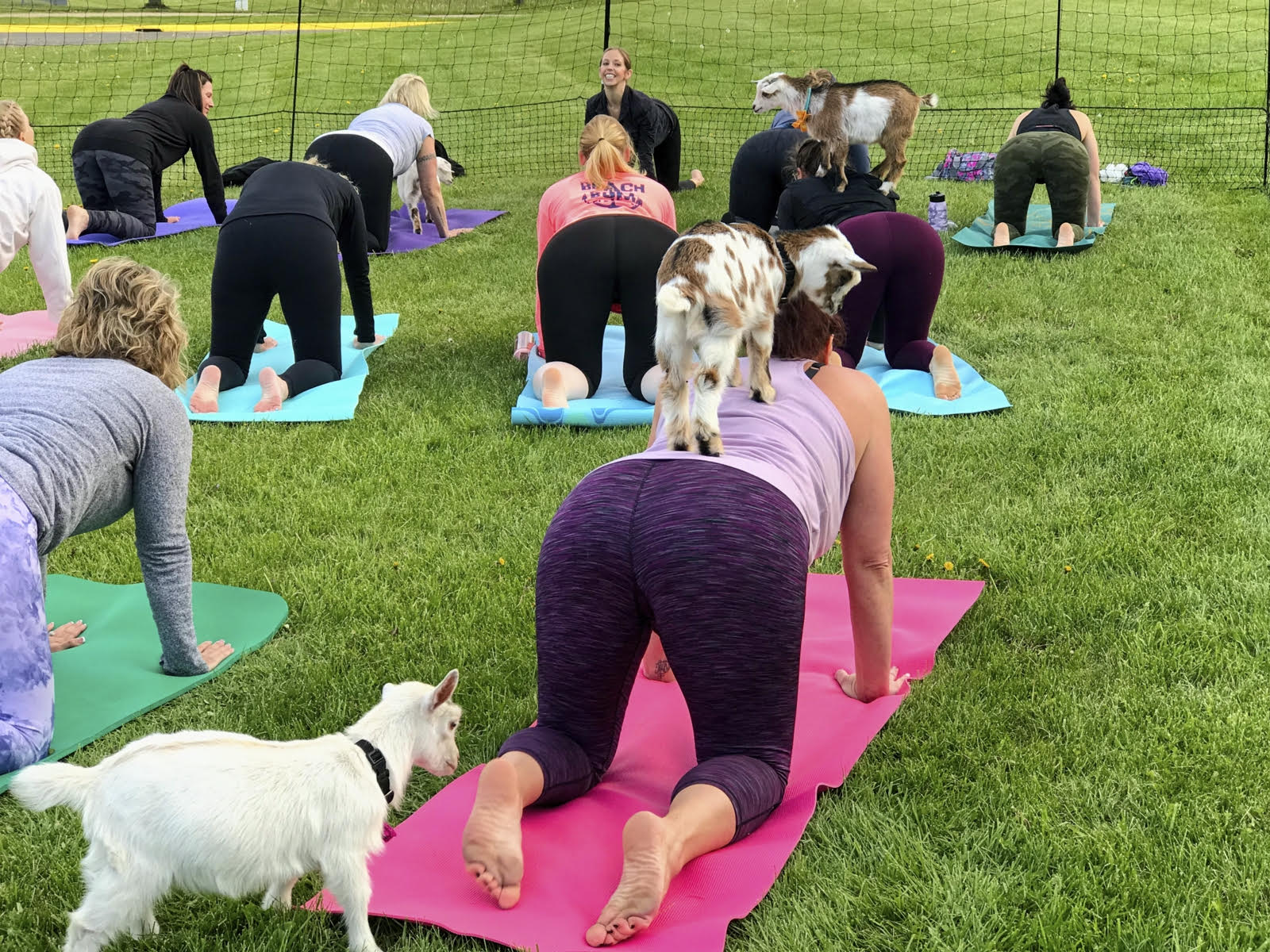 A basket which includes a two tickets for to any goat yoga event with BreakAway Yoga Studio, a yoga mat and water bottle.